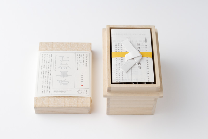 日本で昔から一般家庭やお祝いの場で使われてきた「折形」という作法の中で、箸包みなどに用いられる平らな紙を結んだ時に得られる正五角形のイメージを、厳選した5 種類の茶葉になぞらえながら視覚化しています。